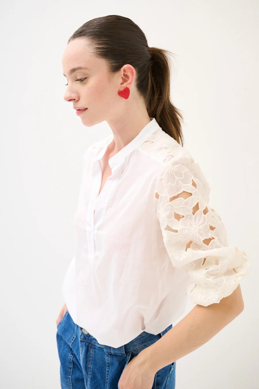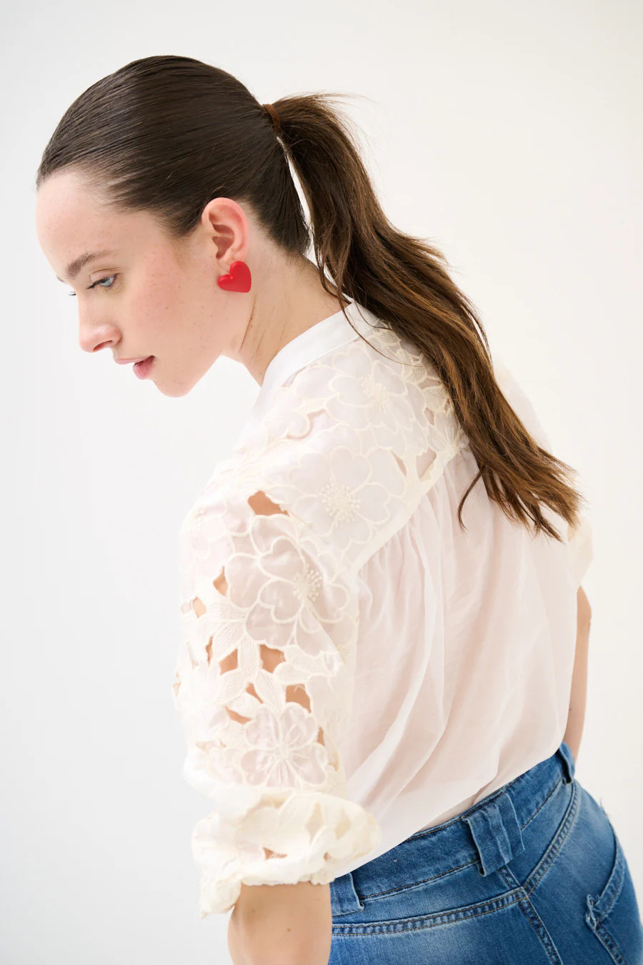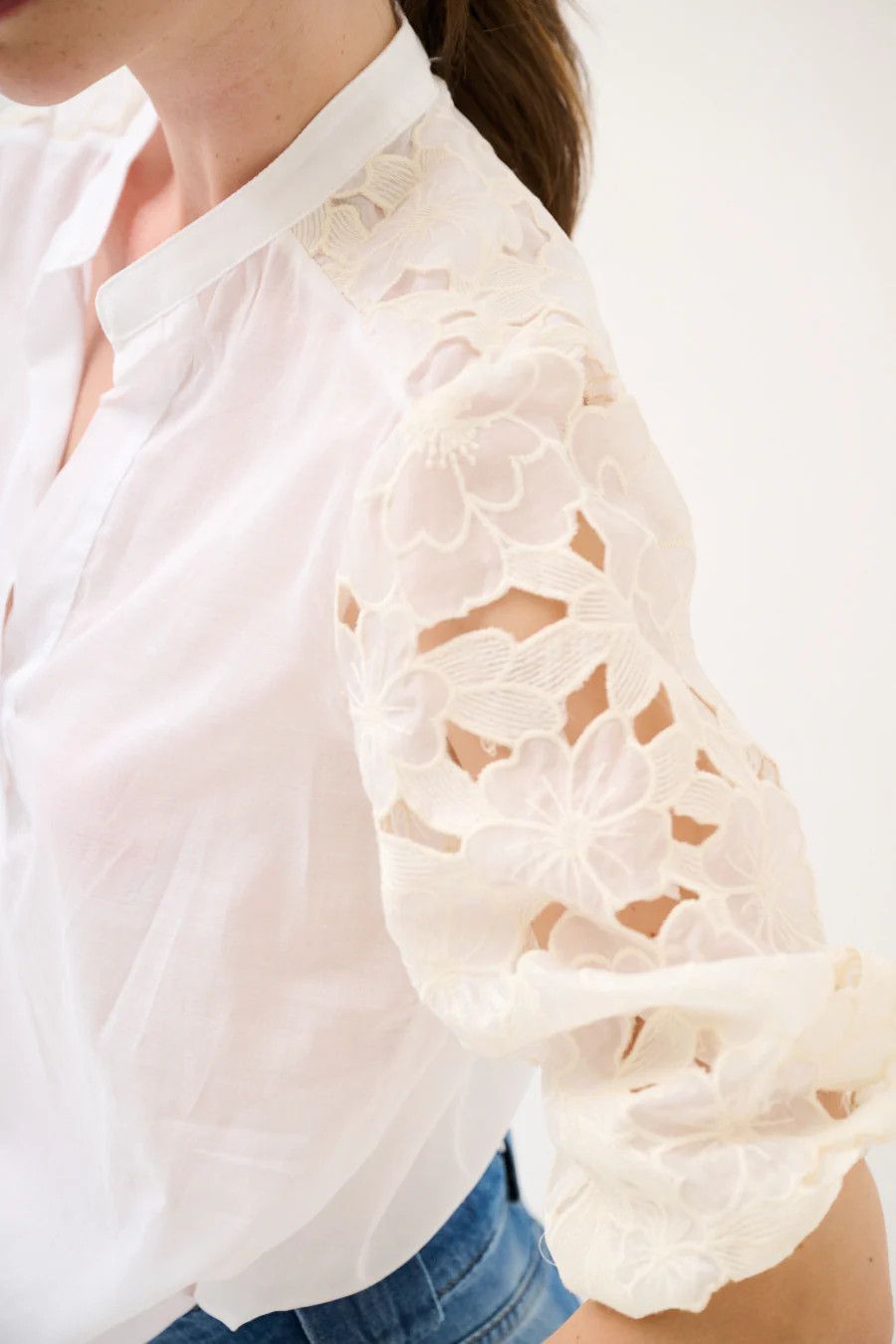 Elegantní halenka s otevřeným výstřihem do V a jemným stojáčkem zaujme ženskými detaily a lehkostí. Nadýchané rukávy zdobené květinovou krajkovou výšivkou a výřezy dodávají romantický nádech. Volnější střih těla vytváří vzdušnou siluetu, zatímco rukávy jsou lehce nařasené a zakončené pružnými manžetami pro pohodlné nošení. Poloprůsvitné provedení podtrhuje jemnost a ženskost celého modelu – ideální pro elegantní denní i večerní outfit.